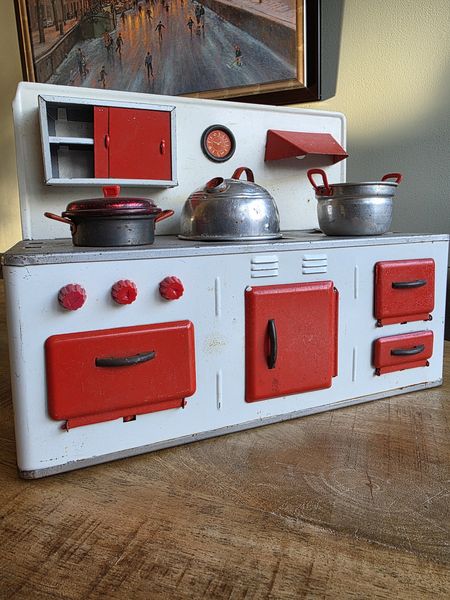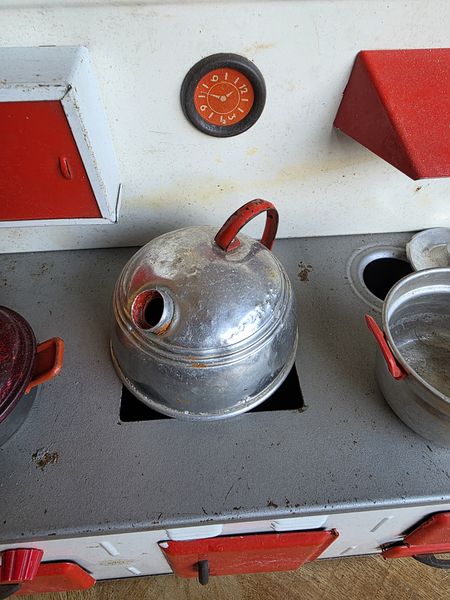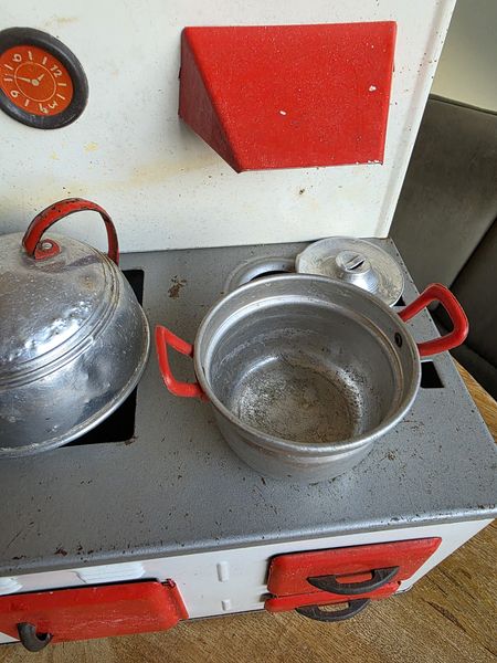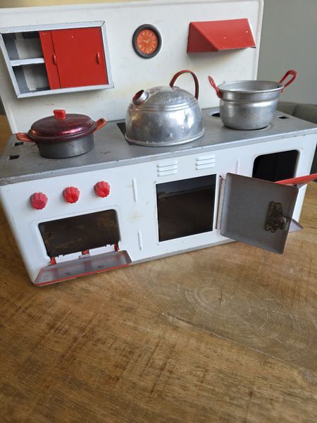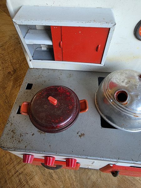 Prachtig rood wit vintage blikken keukentje in vintage staat. Het wasbakje ontbreekt en het dopje van de fluitketel.