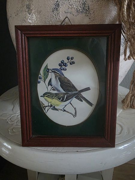 Vintage houten lijstje met afbeelding van vogeltjes in ovalen passe-partout.