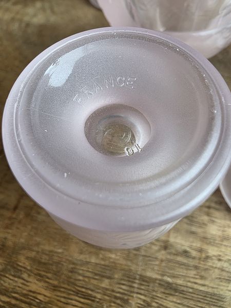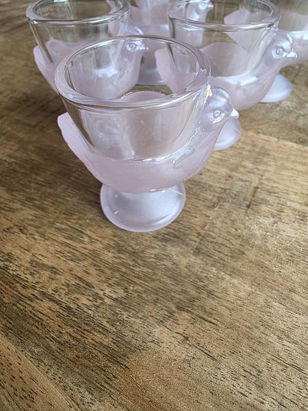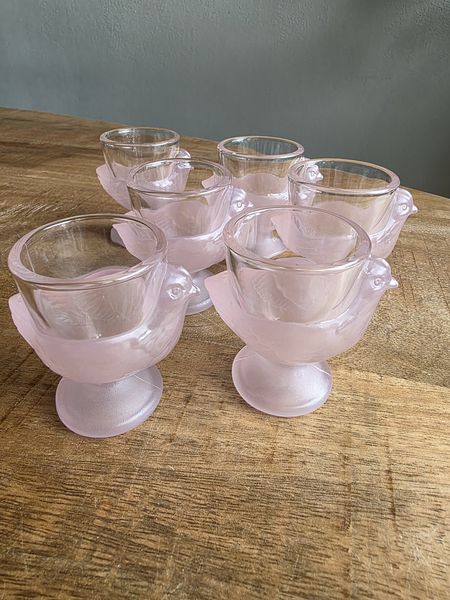 Zes vintage glazen eierdopjes in de kleur roze. Deze komen uit Frankrijk (aan de onderkant gemerkt). Leuk om je paastafel mee op te fleuren!