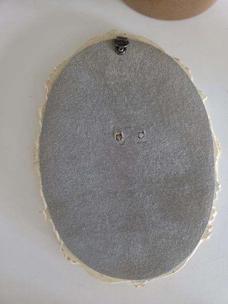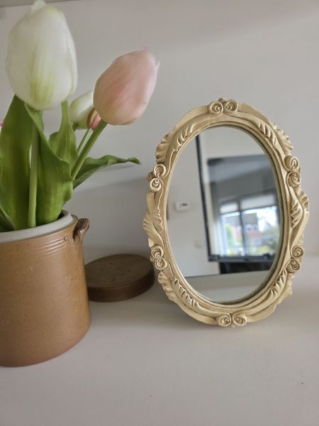 Vintage ovale spiegel met een romantische sierlijst. De lijst heeft verfijnde ornamenten en een zachte crème kleur, wat zorgt voor een klassieke en stijlvolle uitstraling. Dankzij het compacte formaat is deze spiegel perfect voor op een kaptafel, dressoir of plank. Aan de achterkant een ophangoogje waarmee je het spiegeltje kunt ophangen.