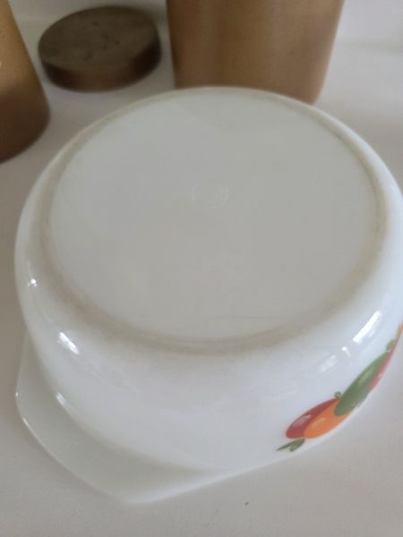 Vrolijke vintage schaal van wit glas met een kleurrijke fruitdecoratie. Rondom de schaal zijn appels en sinaasappels afgebeeld in warme tinten rood, oranje en groen, wat zorgt voor een speelse en nostalgische uitstraling.