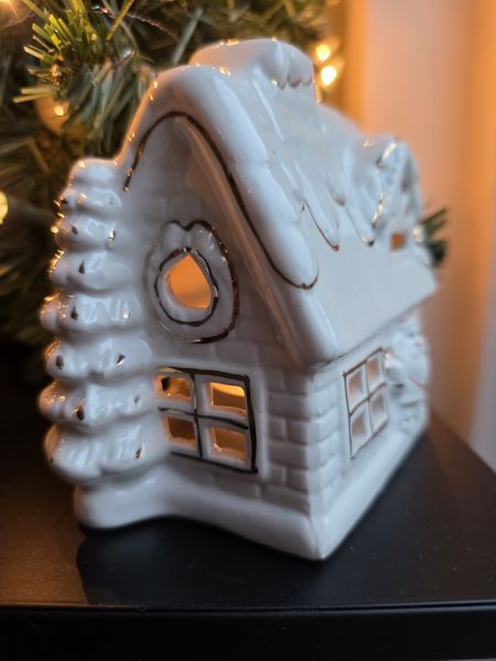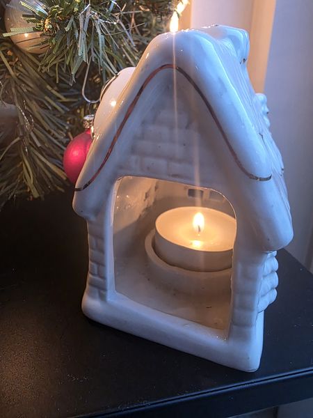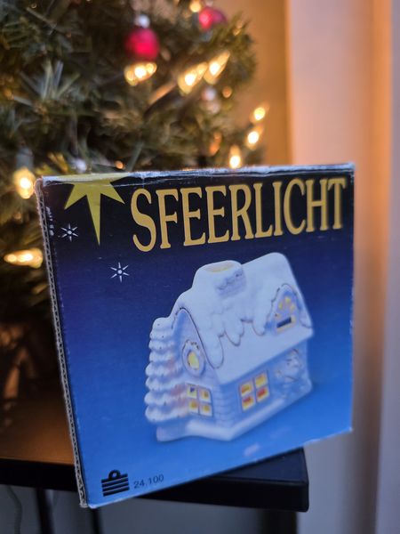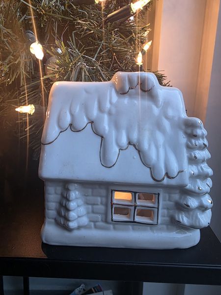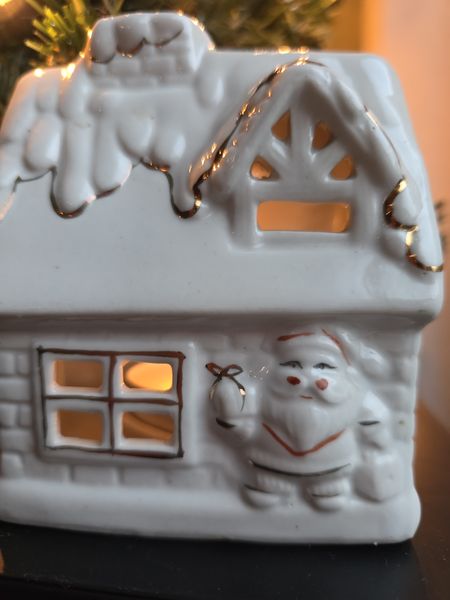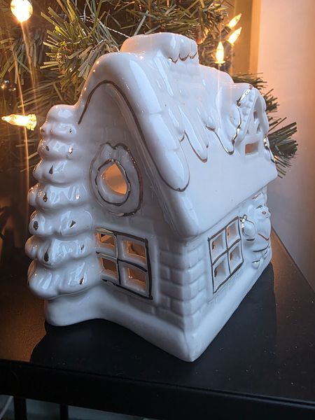 Gezellig vintage porseleinen sfeerlichtje in de vorm van een kersthuisje.