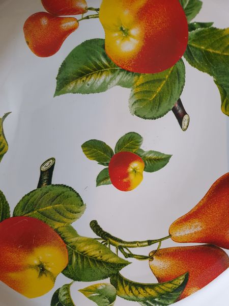 Heel mooi groot emaille dienblad met afbeeldingen van appels en peren in de kleuren oranje en groen. Het dienblad heeft een opstaande rand van 3 cm. hoog en is afgewerkt met een zwart randje. In hele mooie staat.