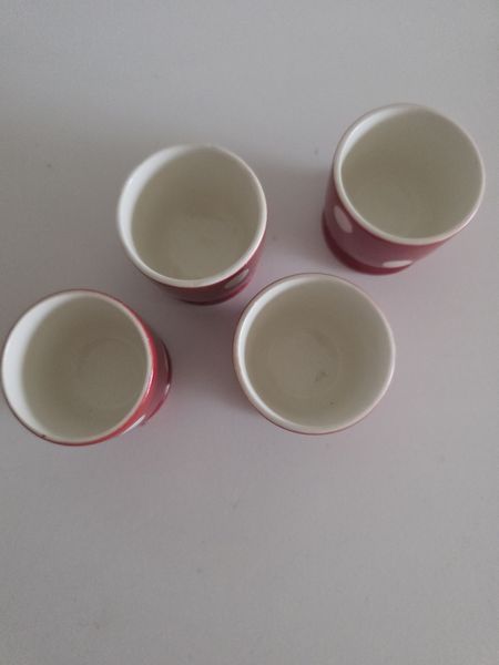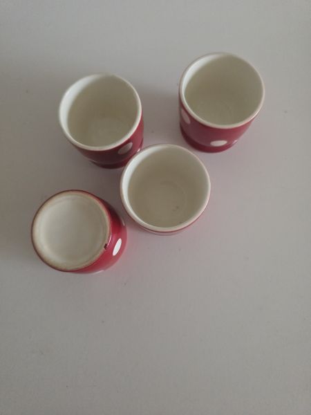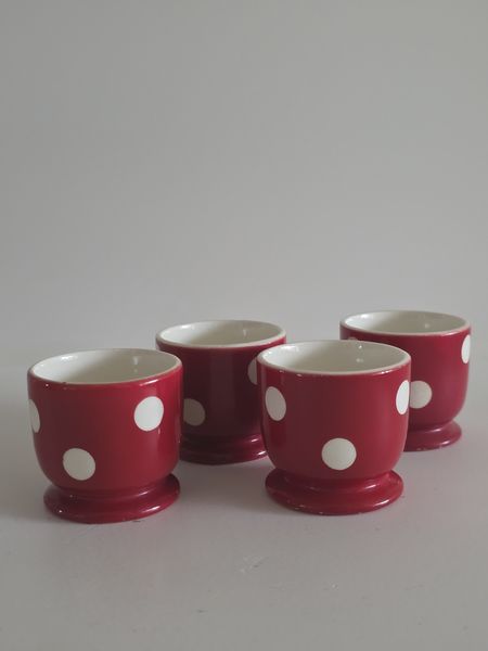 Vier schattige vintage eierdopjes. Rood met witte stippen.