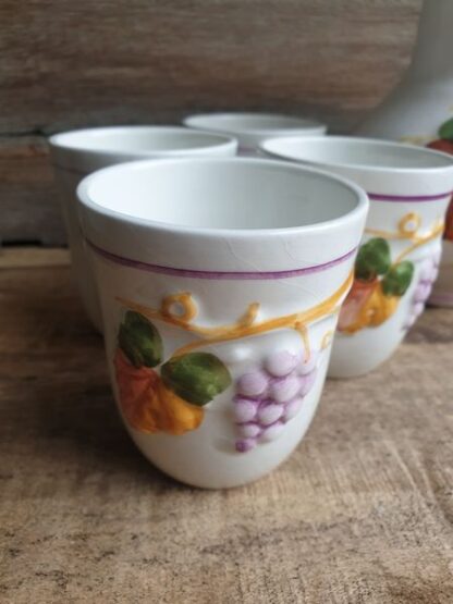 Bij het zien van deze set krijg je meteen een lentegevoel! Een vintage handbeschilderde kan en kopjes met afbeeldingen van druiven en blad in de kleuren paars, groen, bruin en okergeel. Het is oud keramiek en bevat daarom craquelé.
