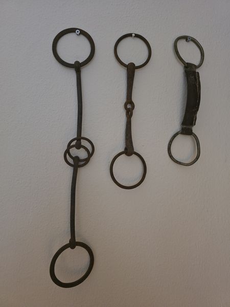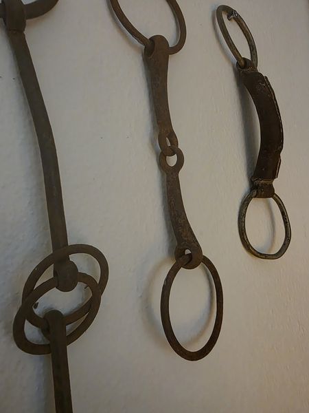Drie vintage paardenbits, waarvan eentje met leer. Leuk om mee te decoreren.